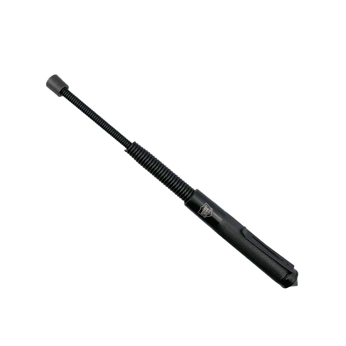 With just a flick of the wrist this 5.5 inch black, steel cylinder expands into a 12 inch spring coil stainless-steel baton with a weighted metal tip. When used to defend yourself, the spring coil causes a whipping effect which builds momentum and increases striking power. Features a textured handle for extra grip, a pocket clip, and glass breaker. Includes nylon pouch with belt loop.