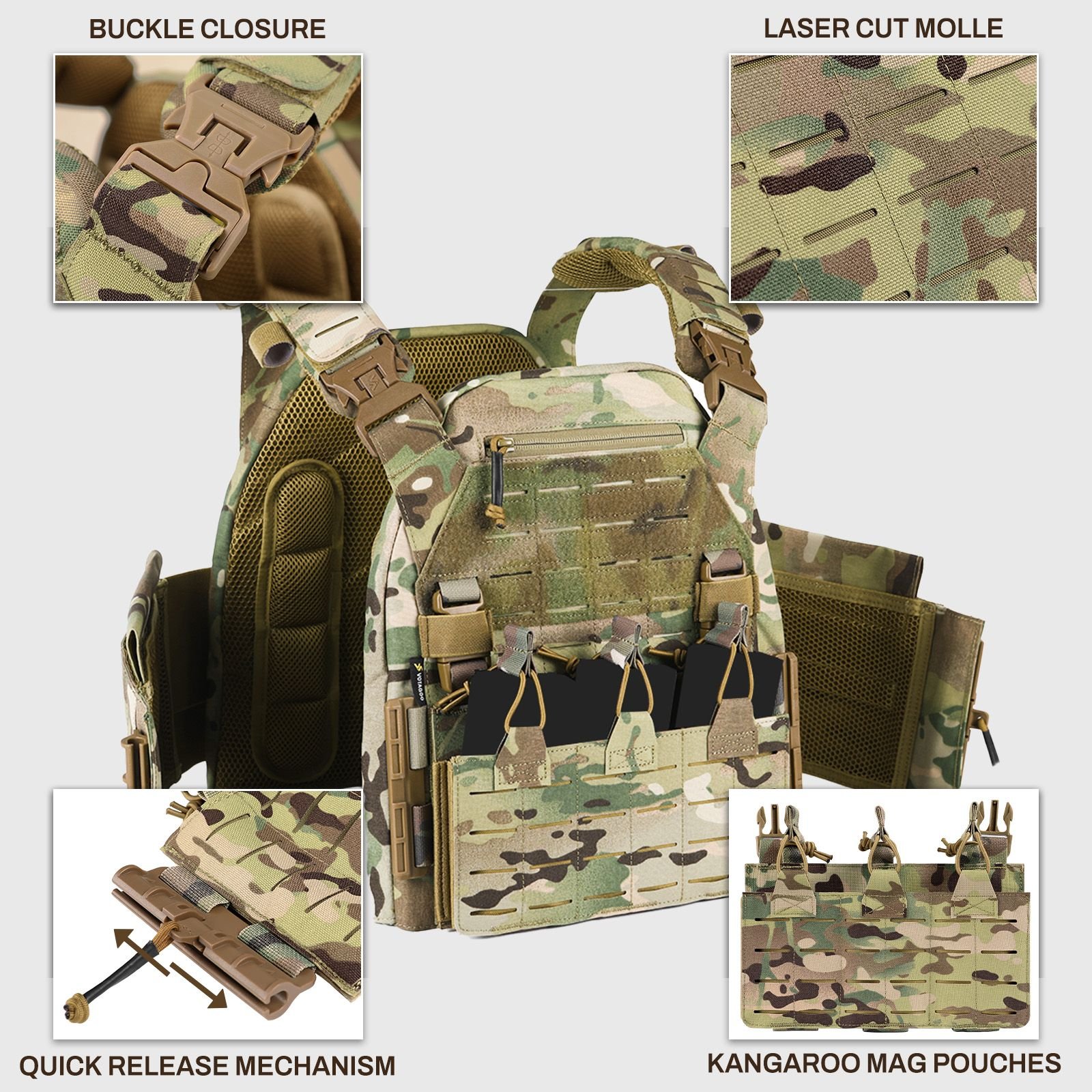 Multifunctional Pockets: Our vest features 3 front kangaroo pouches and 2 side pouches for M4/AR/G36 magazines, The cummerbund  features integrated pockets that can Easily carry essential gear such as magazines, flashlights, maps, medical kits, and more.